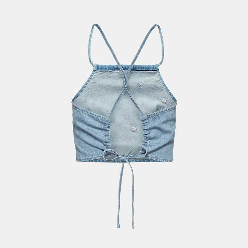 TOP Damski Jasno-Niebieski Tommy Jeans / TOP Women Denim Blue Tommy Jeans – Stylowy, dopasowany top z denimu, idealny na lato. Wykonany z elastycznej bawełny, zapewnia wygodę i swobodę ruchów. Krój typu bandeau odsłania ramiona, a logo „Tommy Girl” dodaje charakterystycznego stylu retro. Świetnie komponuje się z jeansami, szortami lub spódnicą.